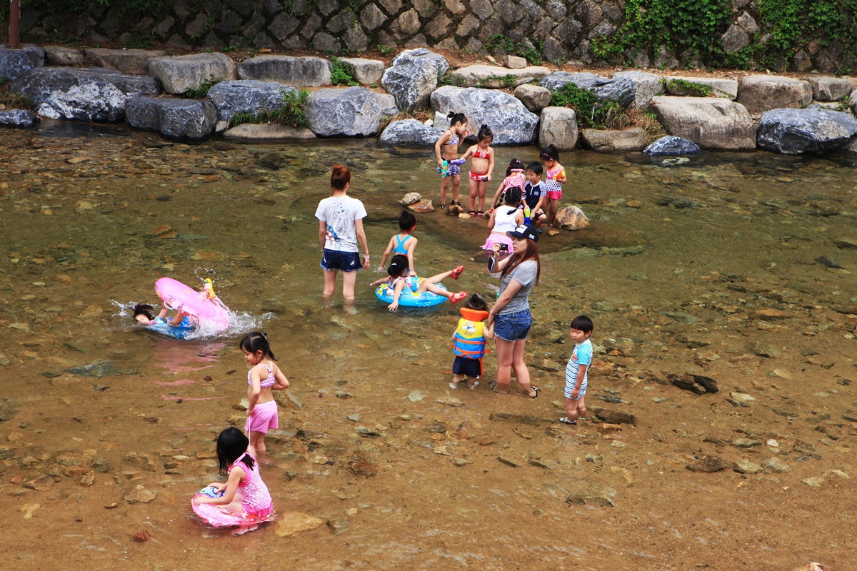 안양 개천에 물놀이하는 어린이들모습.