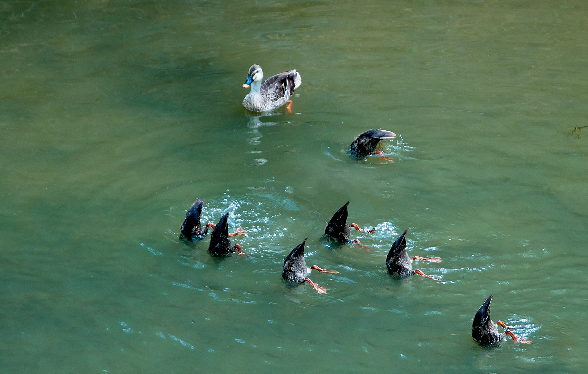 누가올까 감시하며 어미오리가 새끼들의 먹이 모습을 지켜보고 있다,