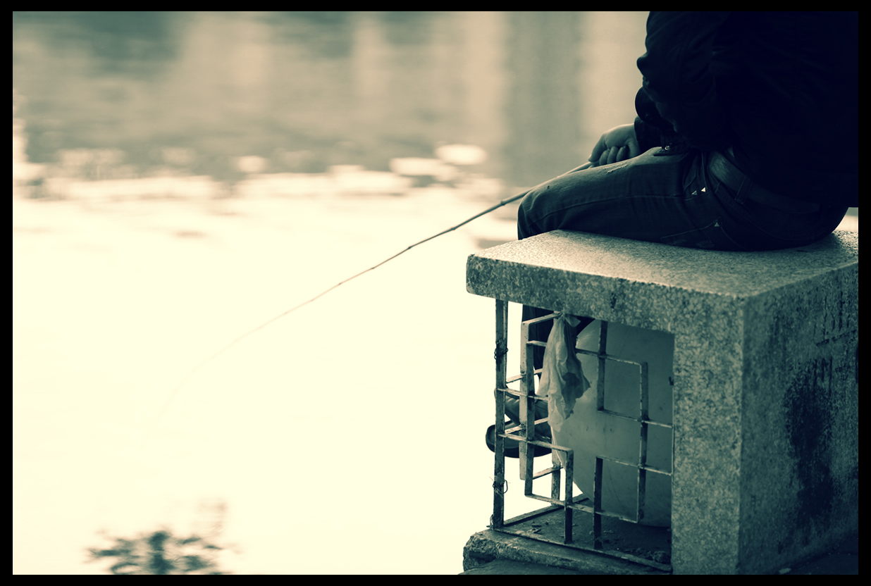 무엇인가 답을 찾기 위해서 어울리지 않는 작은 대나무 낚시대를 잡고 있는 듯합니다.
