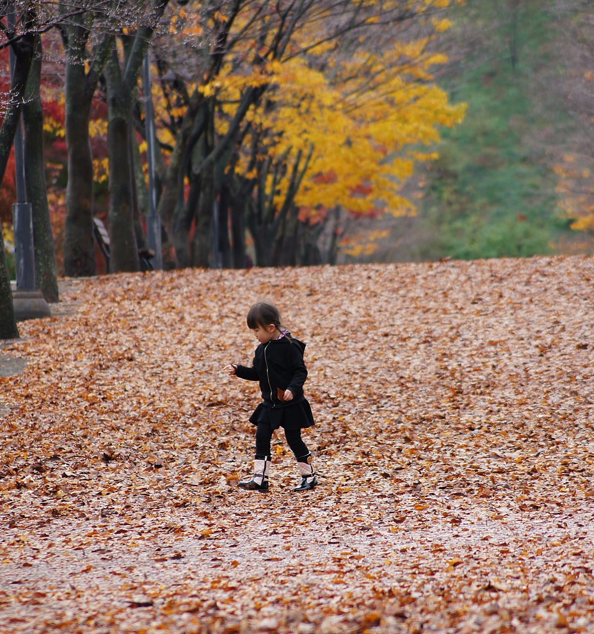 한 손에 낙엽을 꼭 쥐고 꼬마공주가 가을길을 거닐다 무언가를 열심히 찿고 있습니다.