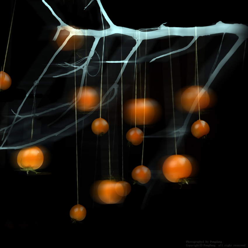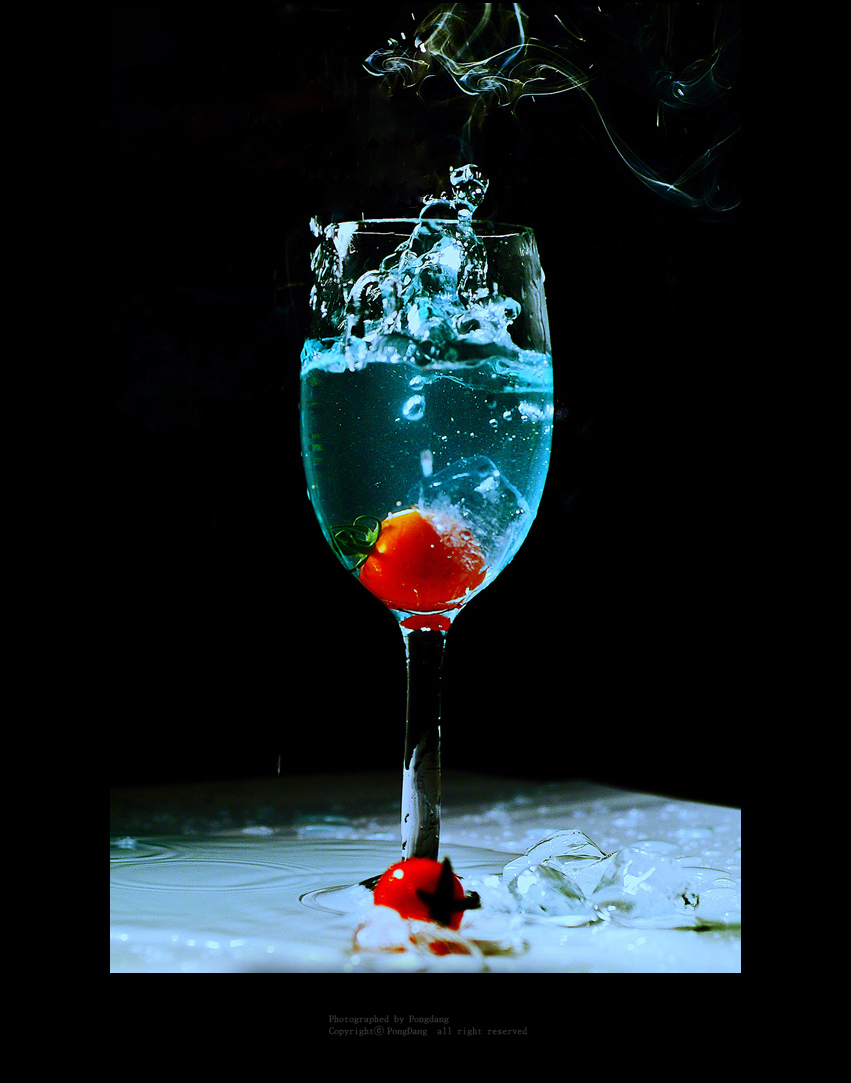 방울토마토 ,얼음 ,색음료수 ,유리컵 ,나무가지 ,실 , 담배연기