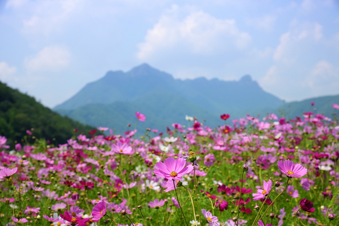 코스모스와 구름 그리고 멀리 보이는 주흘산 자락의 자태