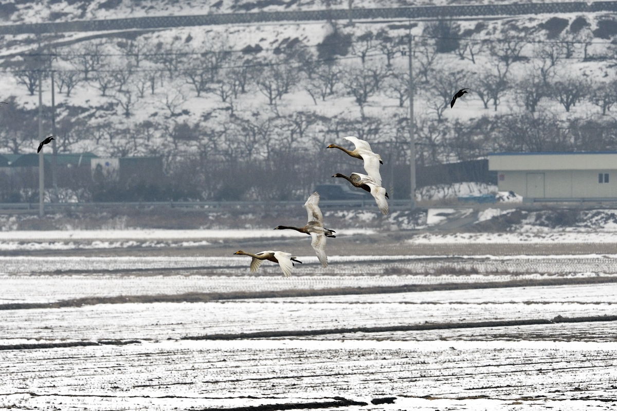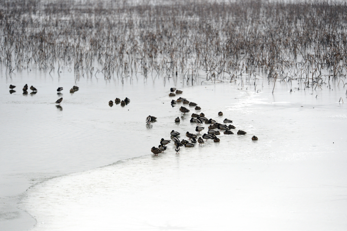 얼어버린 주남지를 지키는 나그네와 터줏대감 참새의 하루를 담았습니다