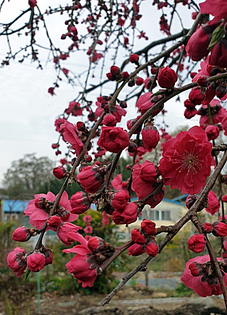 집 마당에 심겨져 있는 능수홍매화 나무에서 피기 시작한 홍매화꽃 을 향하여
