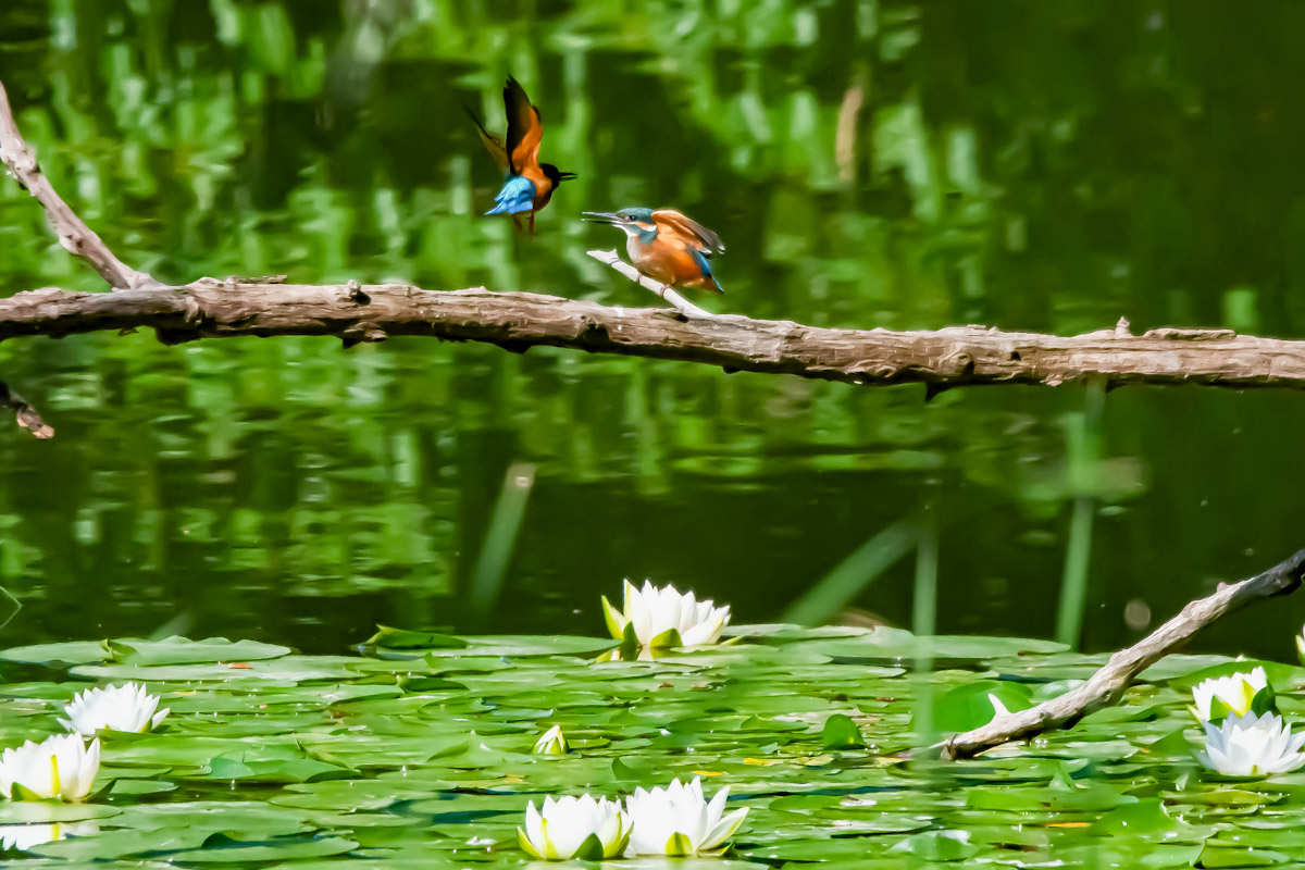 새끼에게 먹이를 주고 사냥가는 물총새와 새끼 물총새