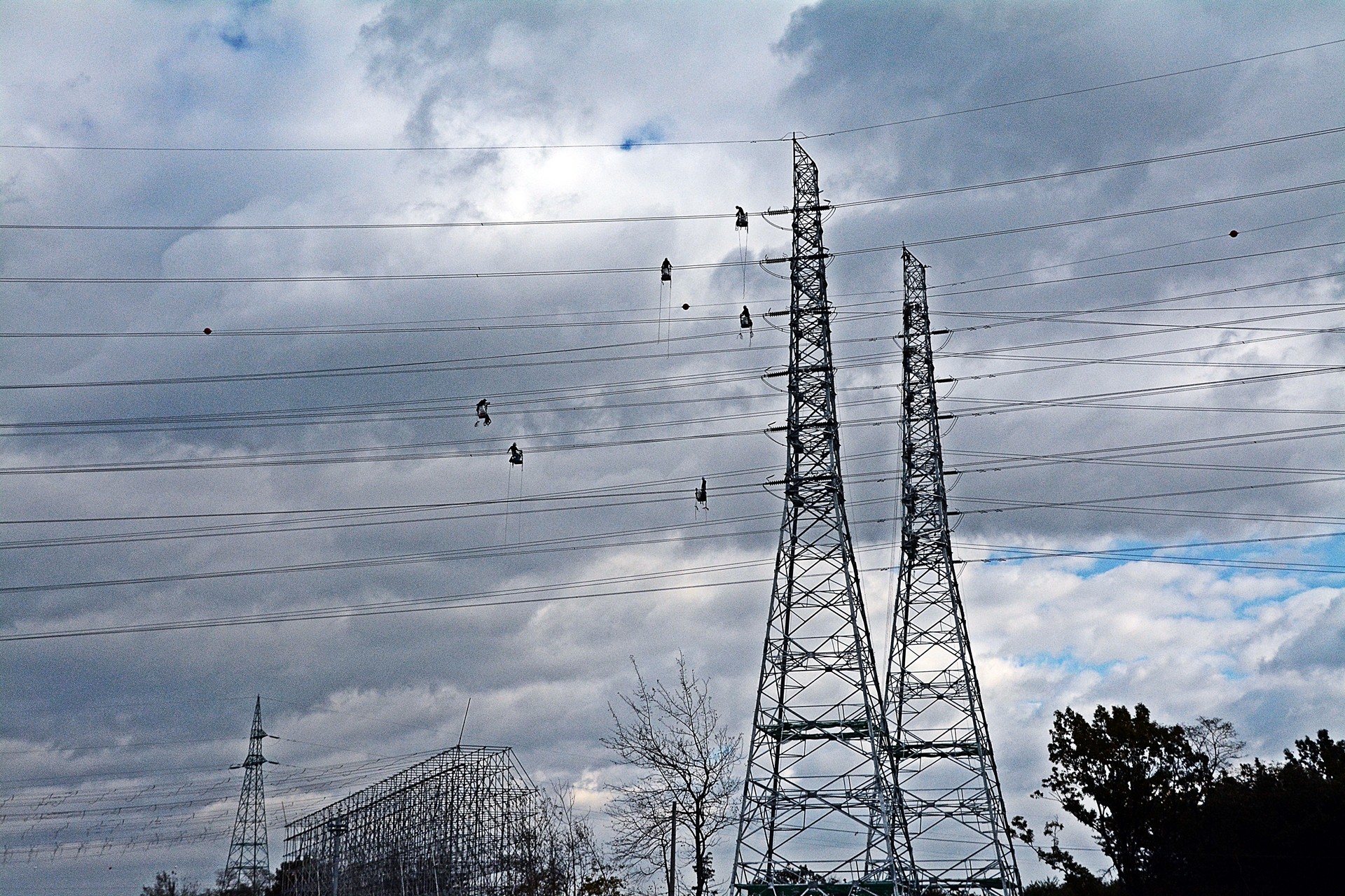 고압선 철탑위에서 작업 하시는 분들을 경부 고속도로 달리면서