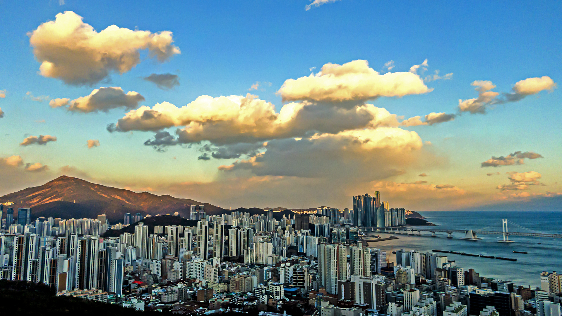 저녁시간에 하늘 높이 걸린 해운대 하늘...