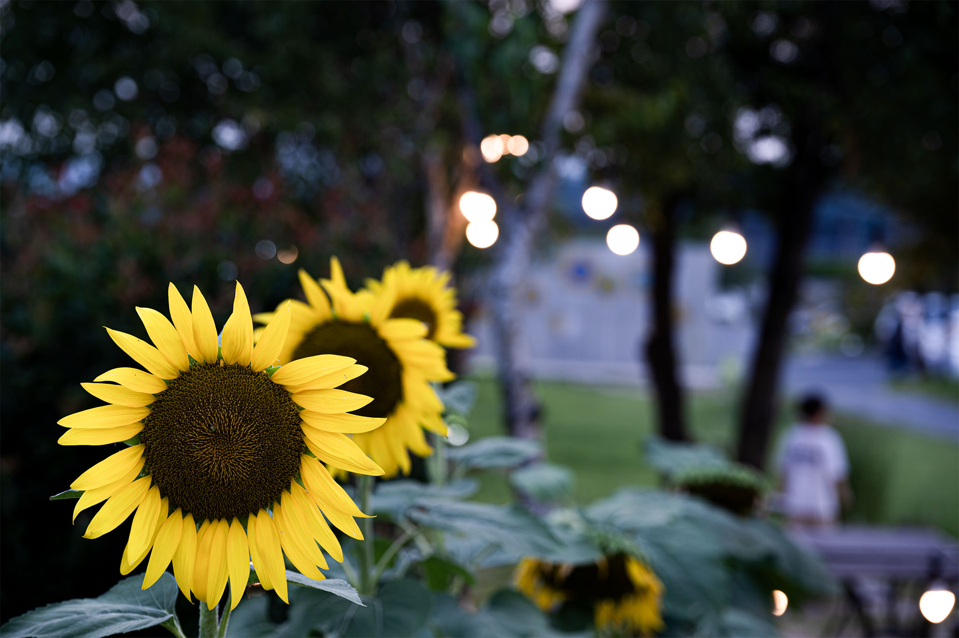 어둑어둑해진 시간에  반짝이는 불빛이 그리운듯 피어있는 해바라기