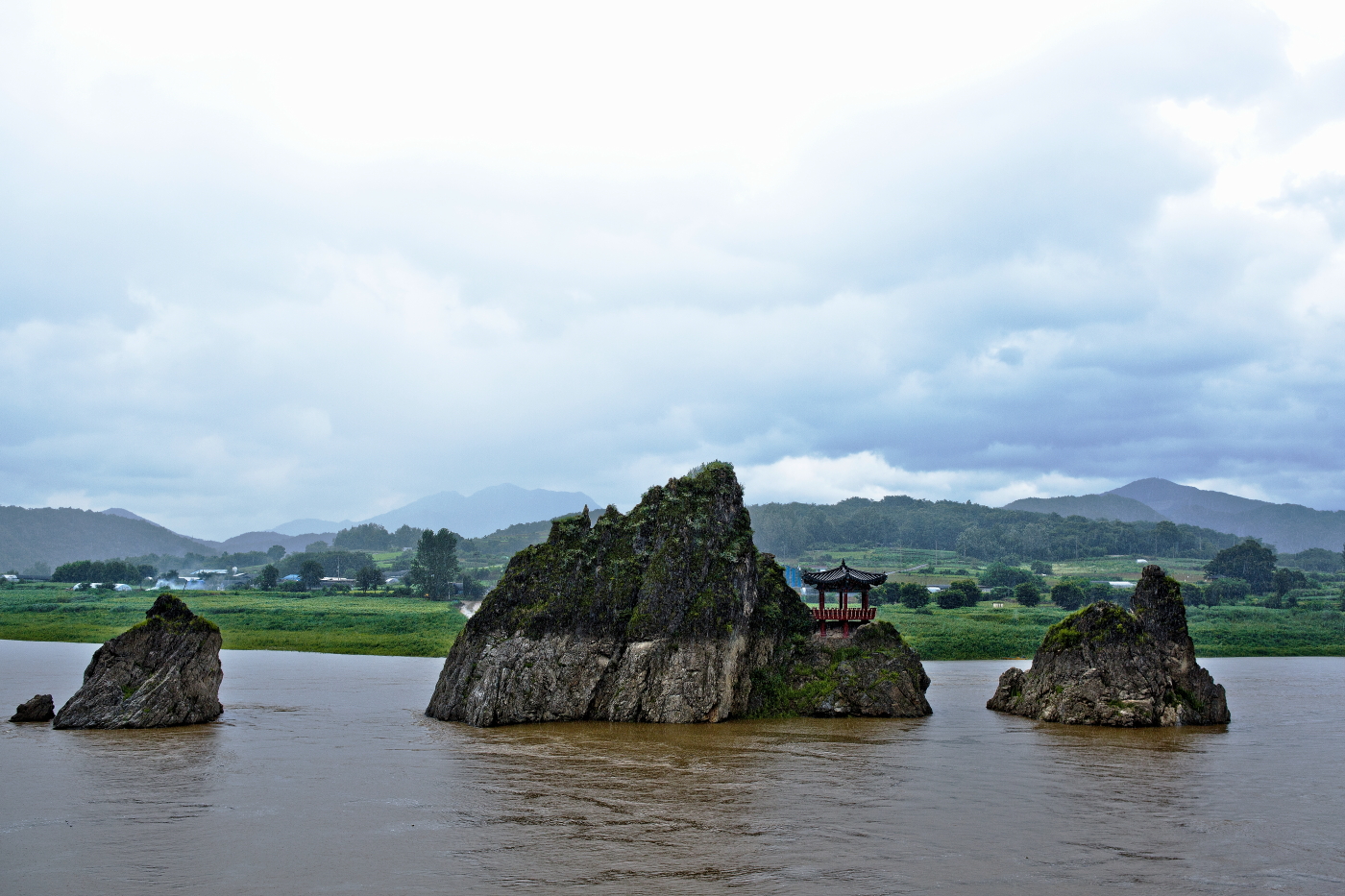 폭우속에 황토빛 물속에 잠긴 도담삼봉