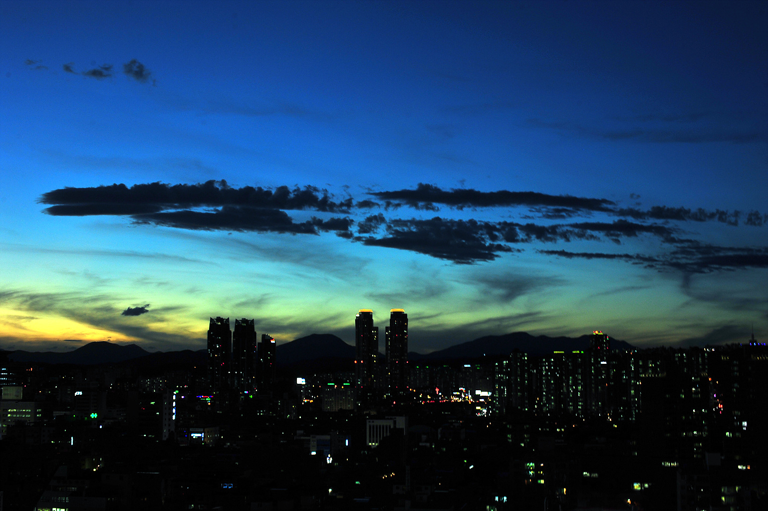 일몰 후 어두운 도시의 얼굴을 봅니다.