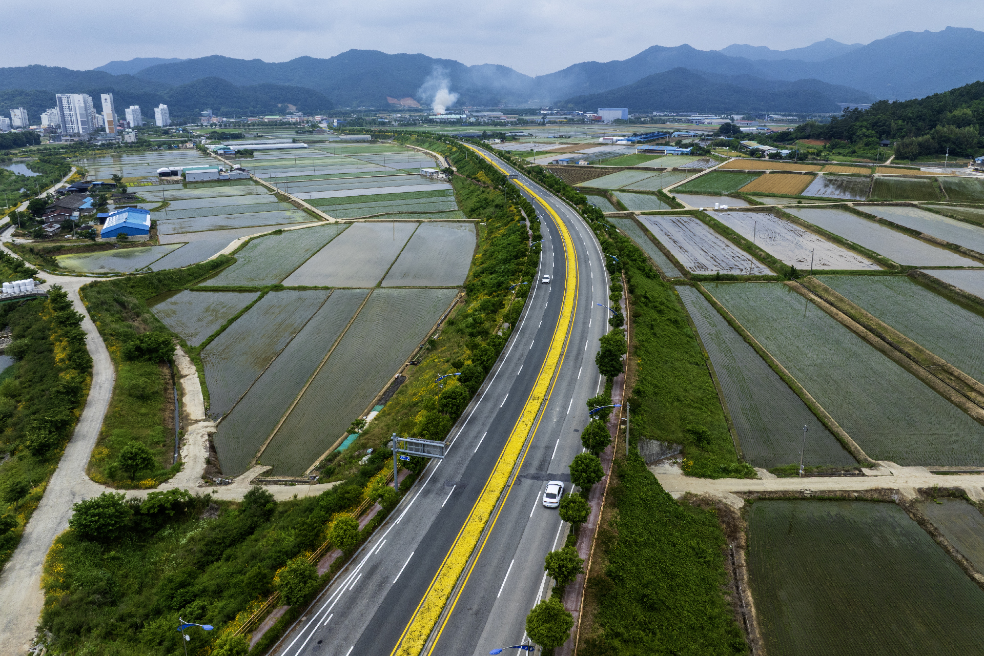 도로 중앙 분리대에 노란 꽃들을 심어놓아