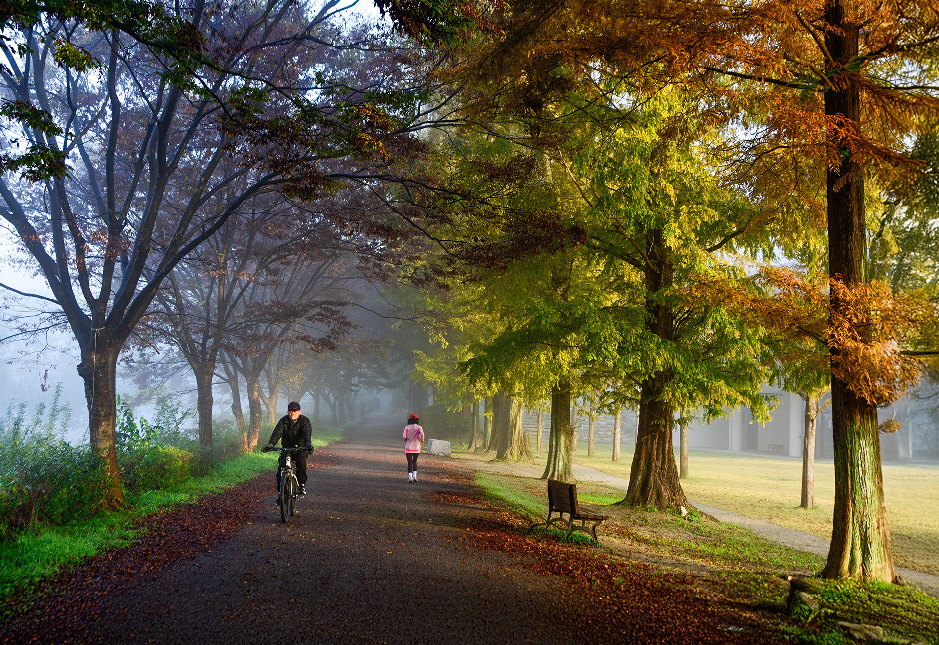 아침에 조금 일찍 나오니 안개가 자욱히 더 일찍 나와 운동하는 사람도