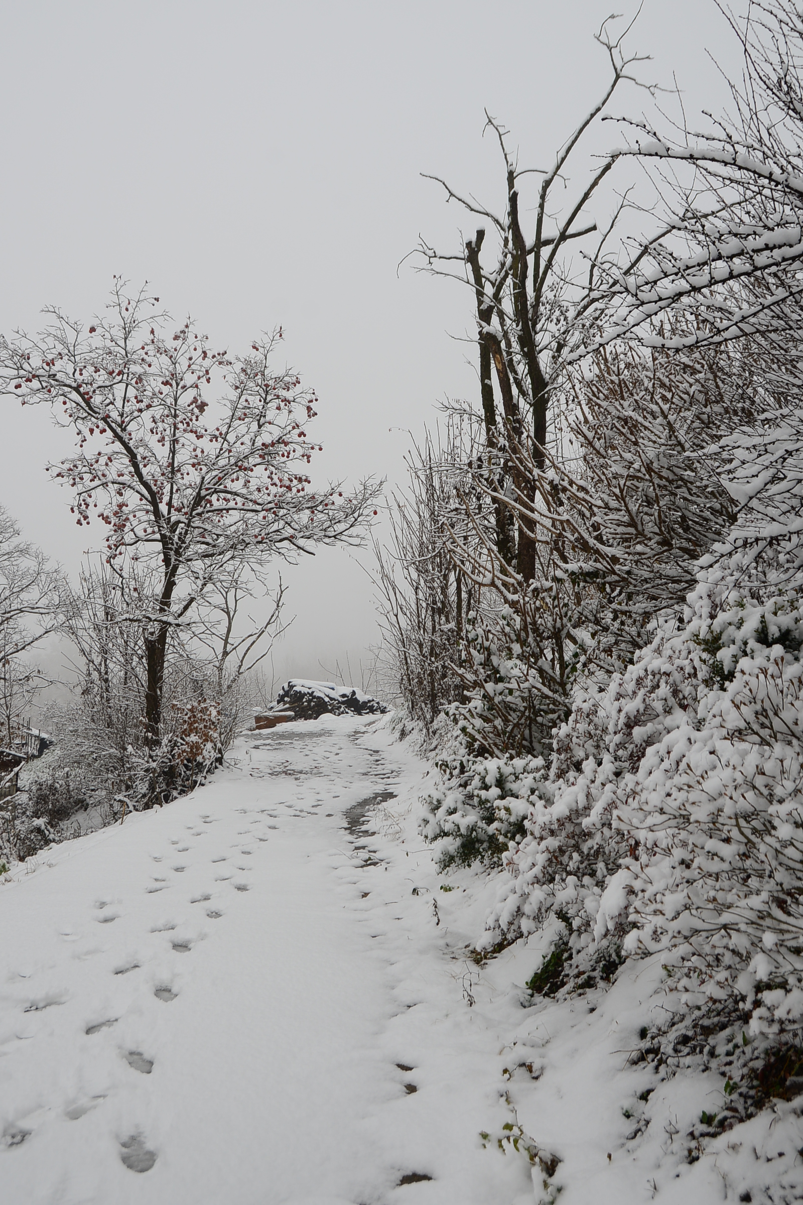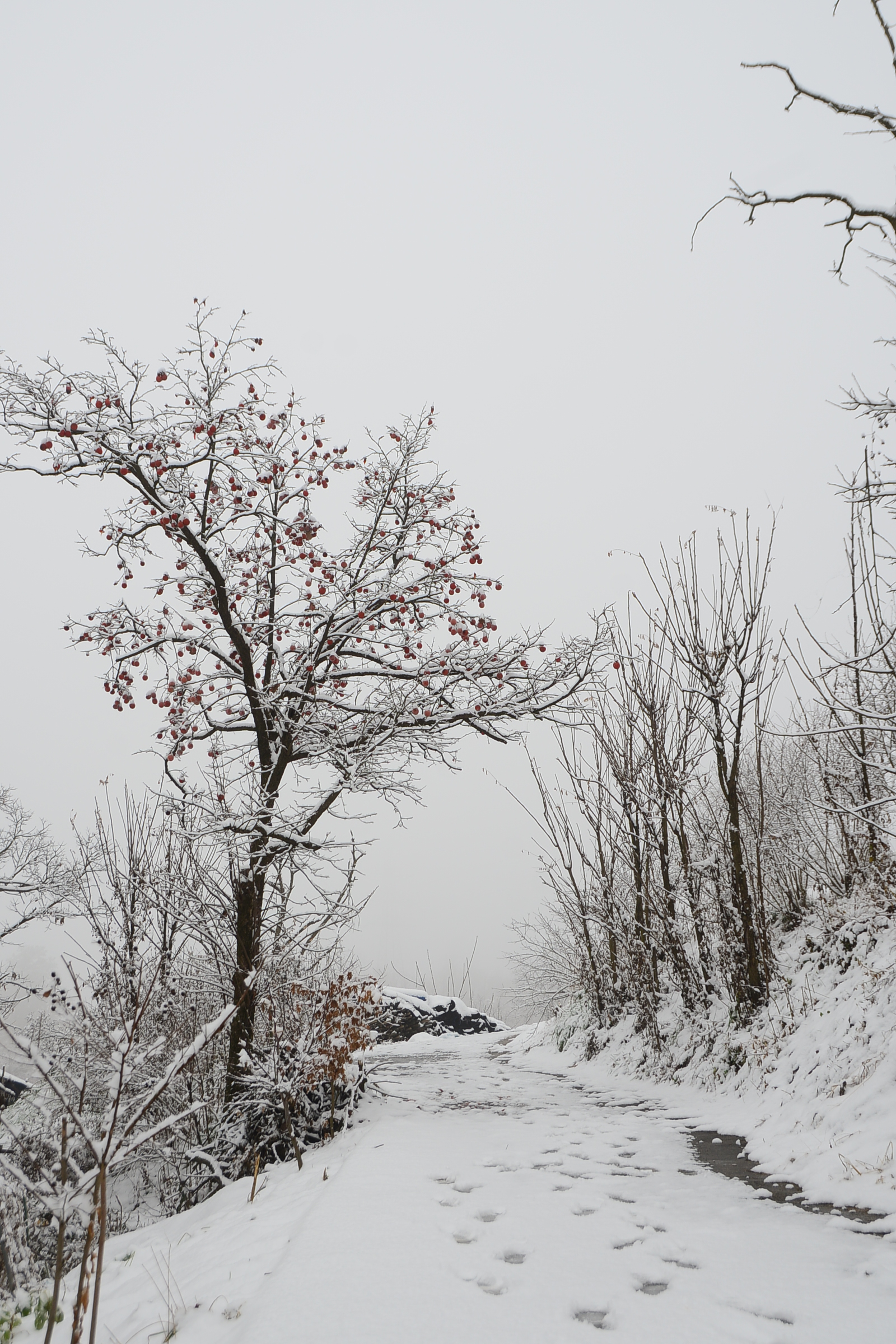 우리집 뒷밭 가는길 감나무와 까죽나무에 初 雪이 앉잣습니다