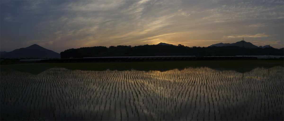 황혼 빛이 논 바닥으로 스며듭니다.