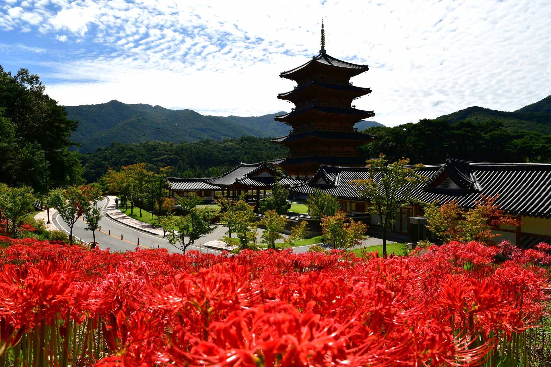 평화의탑을 배경으로 꽃무릇이 붉게 물들어