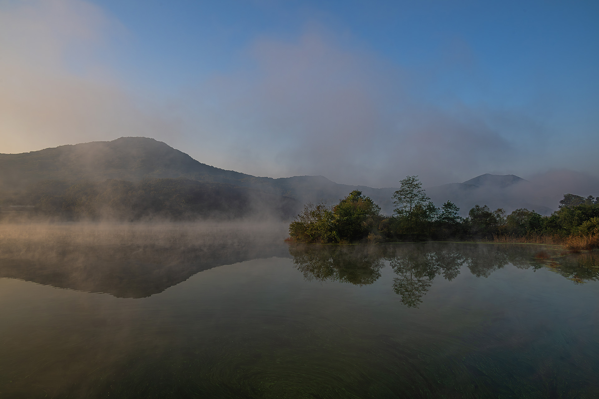 물안개가 살포시 호숫가의 풍경..