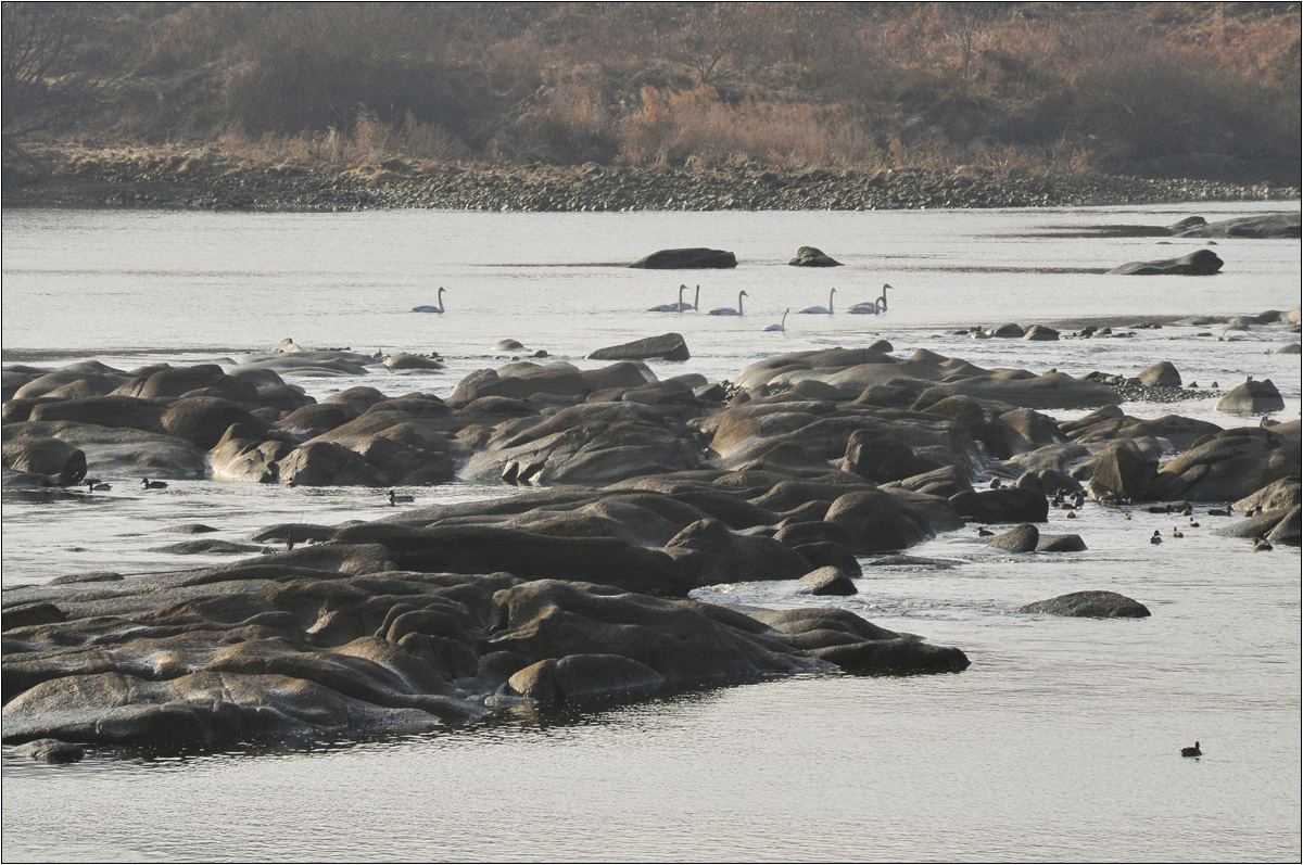 남한강 줄기인 충주댐 아래서 한적하게 놀고 있는 고니를 멀리서 보았습니다.