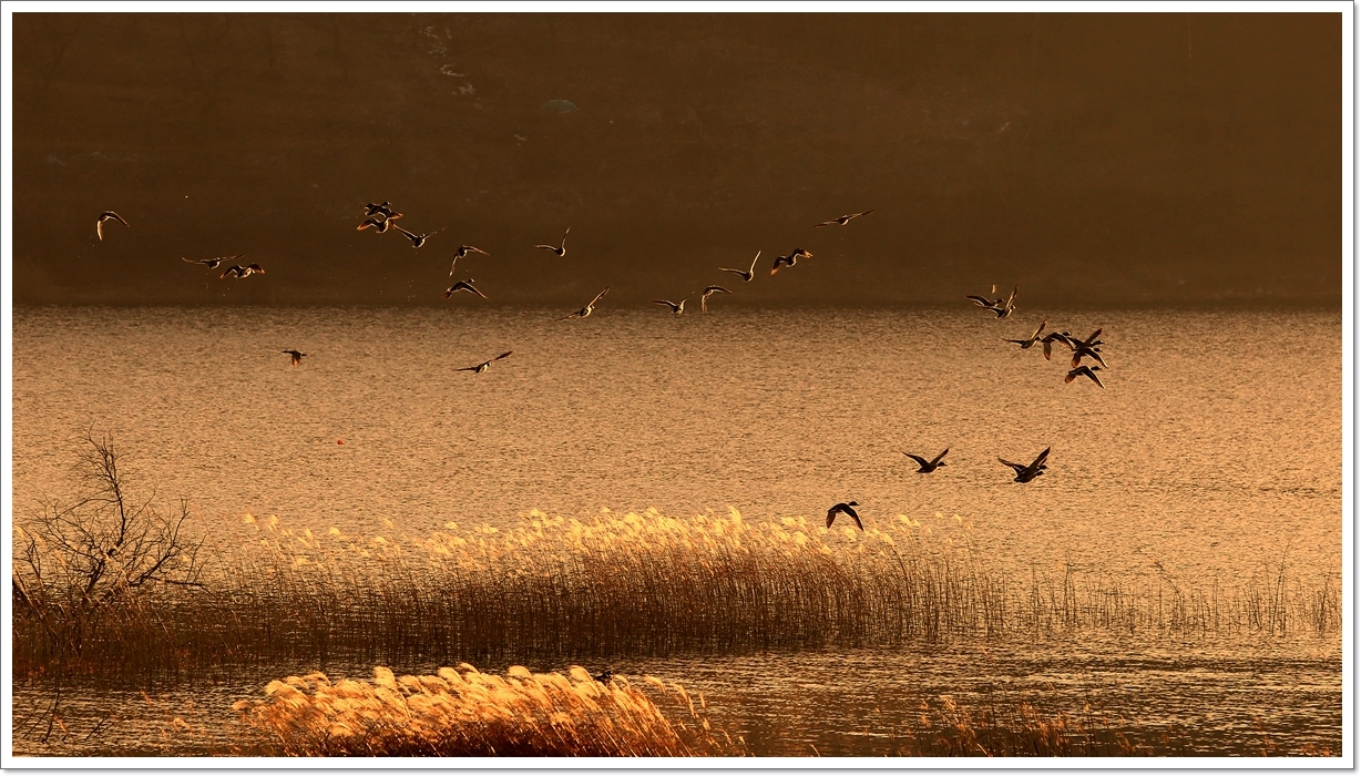 갈대숲 사이 잔잔한 물결 위로