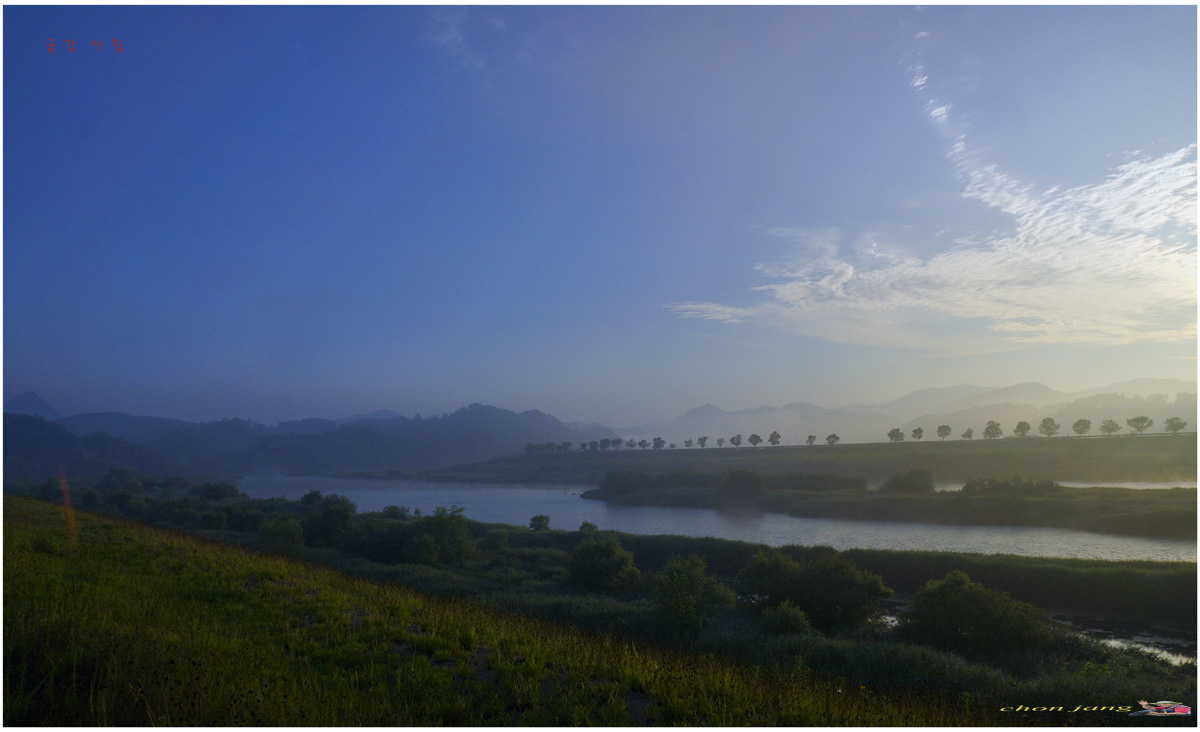 옅은 안개가 강물 위로 피어 오르고 동쪽엔 구름도 이쁩니다.