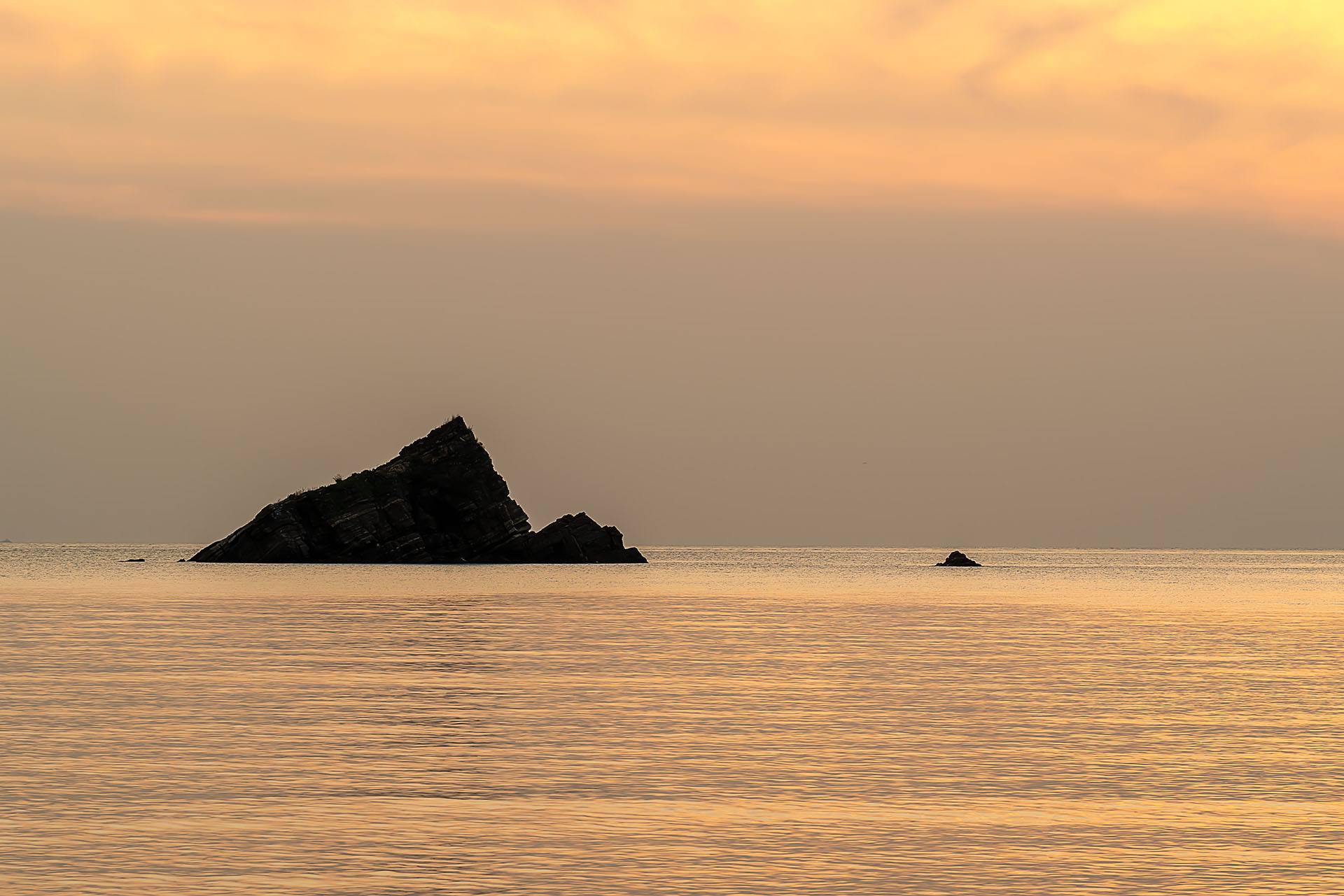 먹구름이 내려앉았지만 바닷물은 황금빛으로 물들인 저녁노을이었습니다.