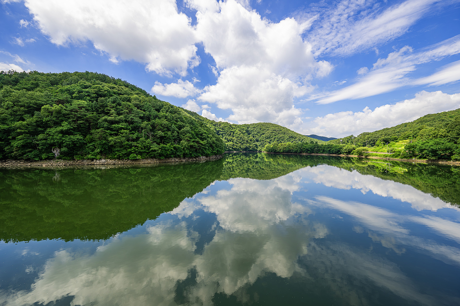 구름 좋은날 호숫가의 반영..