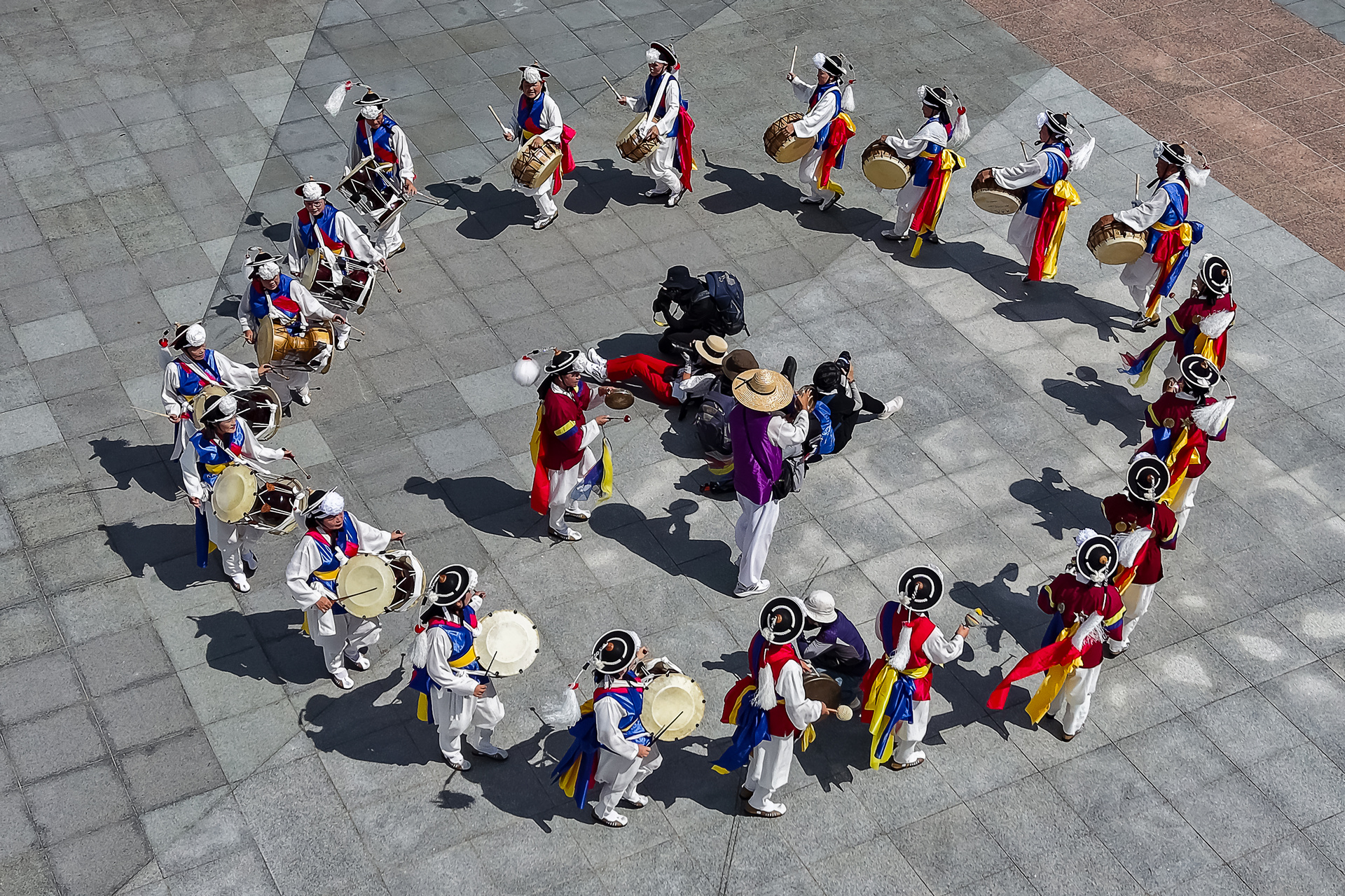 사진가들이 농악대에 포위되었습니다.