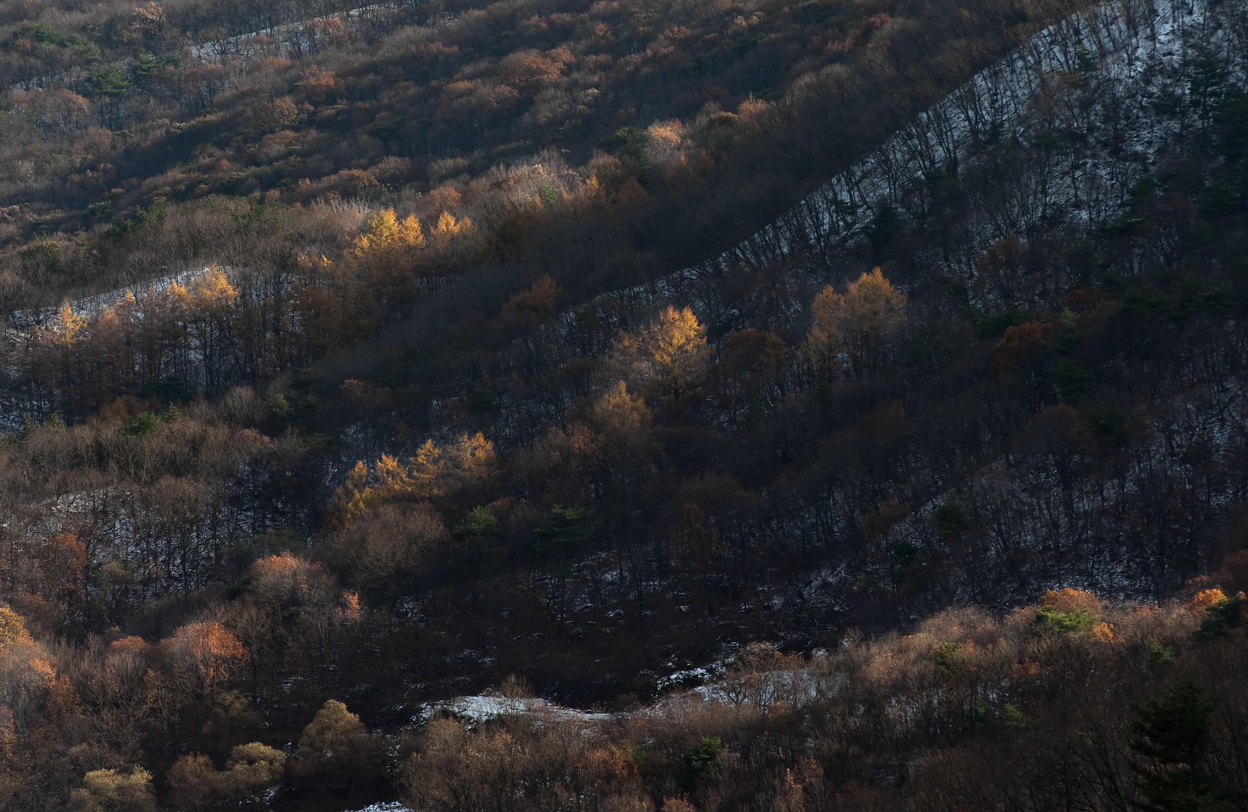 산기슭에 눈이 쌓이고 나뭇잎에 색이 짙게 변할즘에