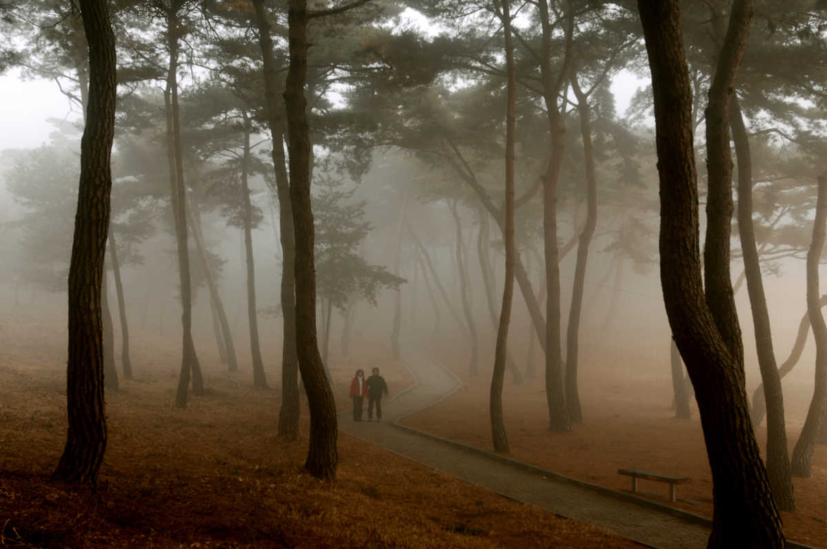 안개가 자욱한 소나무길