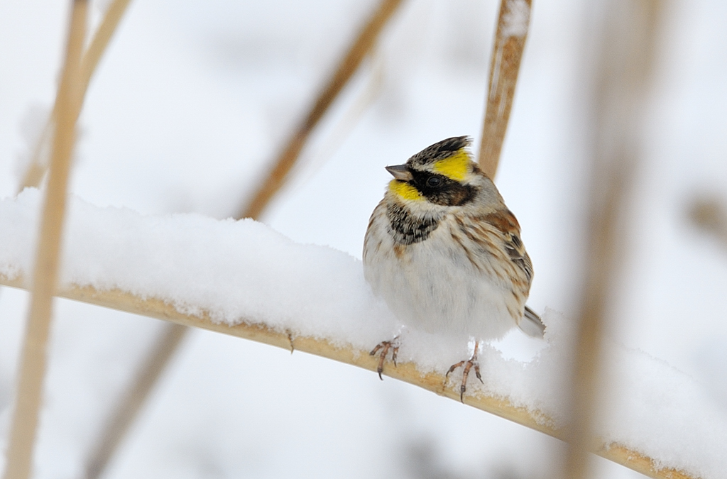 그 눈을 조용히 즐기고 있는 노랑턱멧새입니다.
