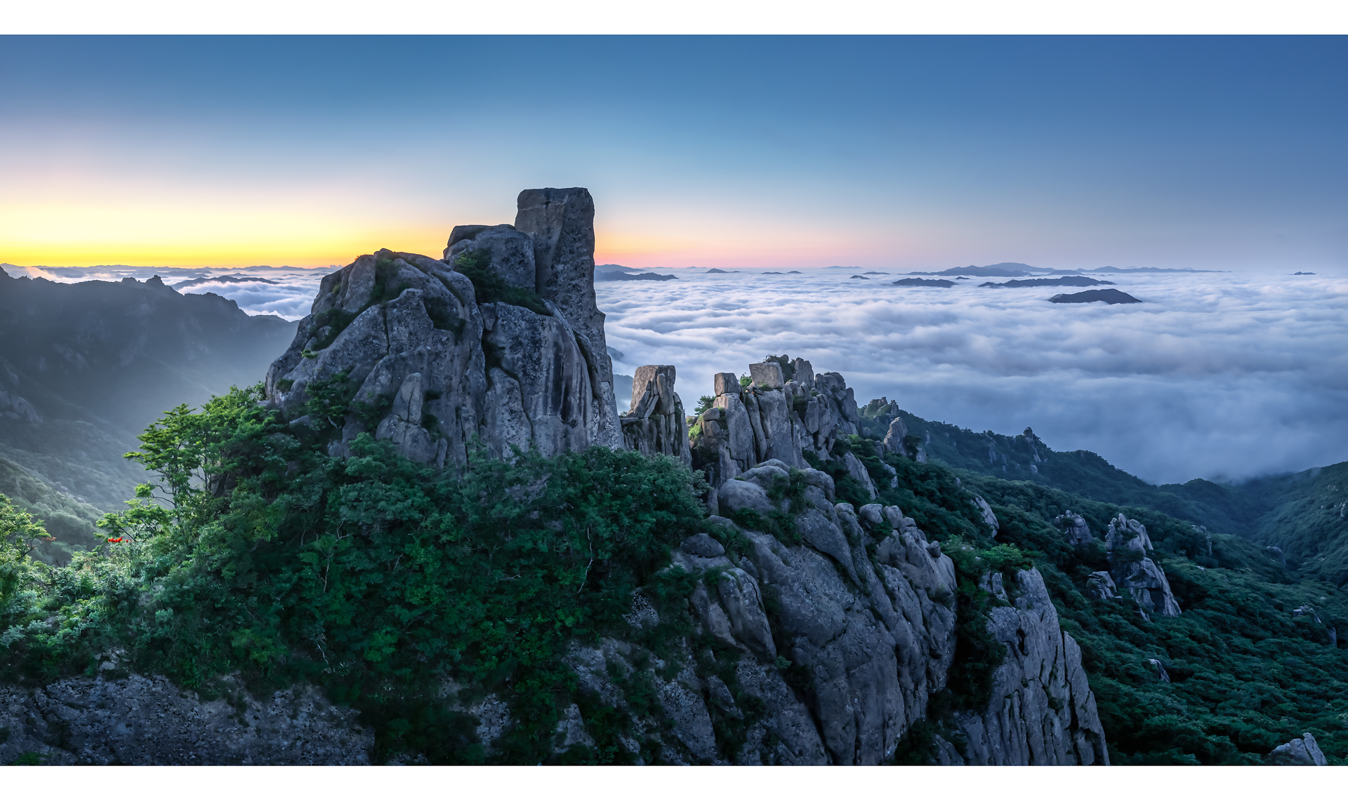 푸르른 숲과 웅장한 암봉이 조화를 이루고 수평선 너머로 퍼지는 여명의 황금빛이