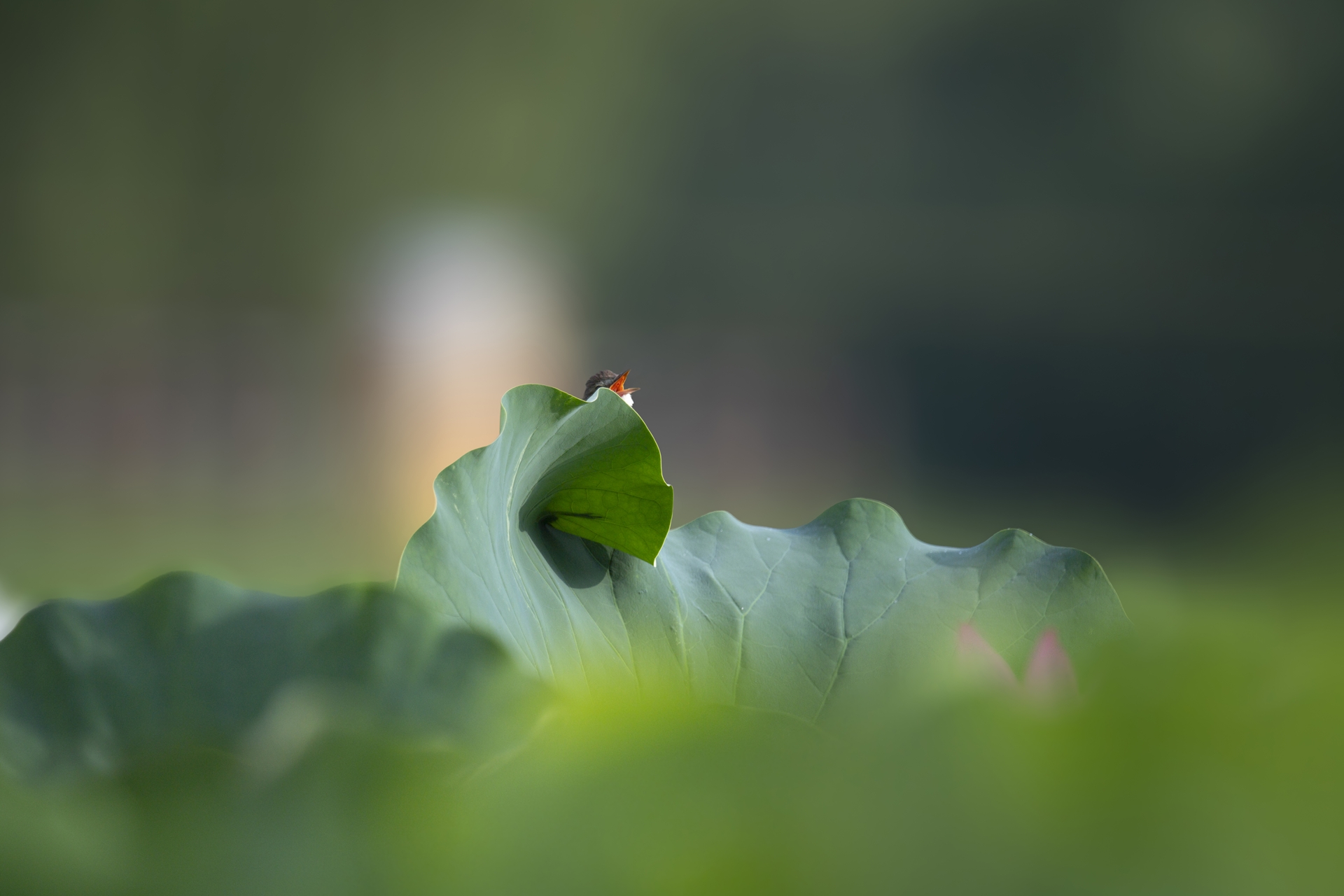 개개비가 앉아 휘어진 연잎으로 인해 마치 파도타기를 하는 모습처럼 보이네요.