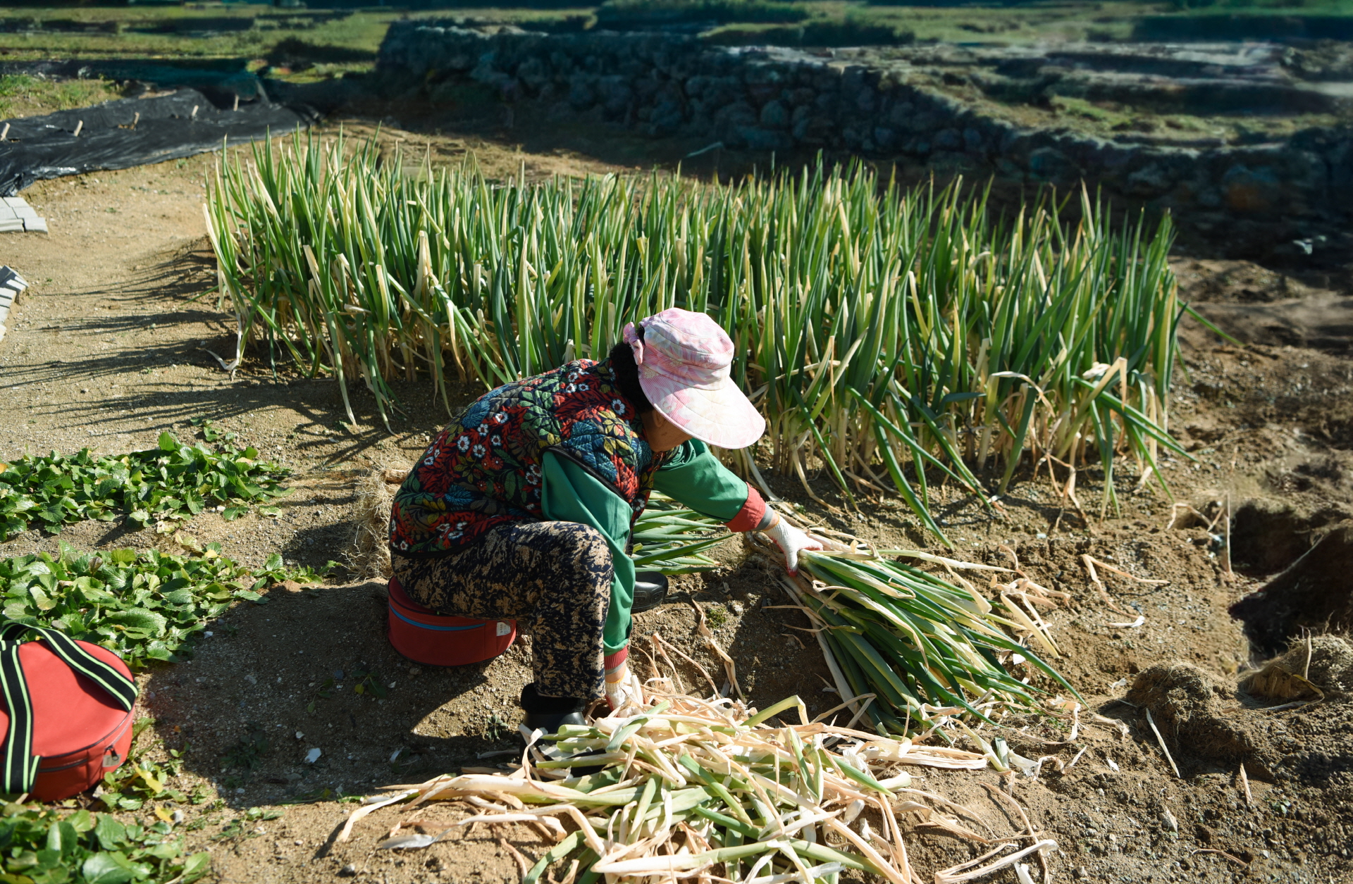 허리를 굽혀 힘든지고 모르신다