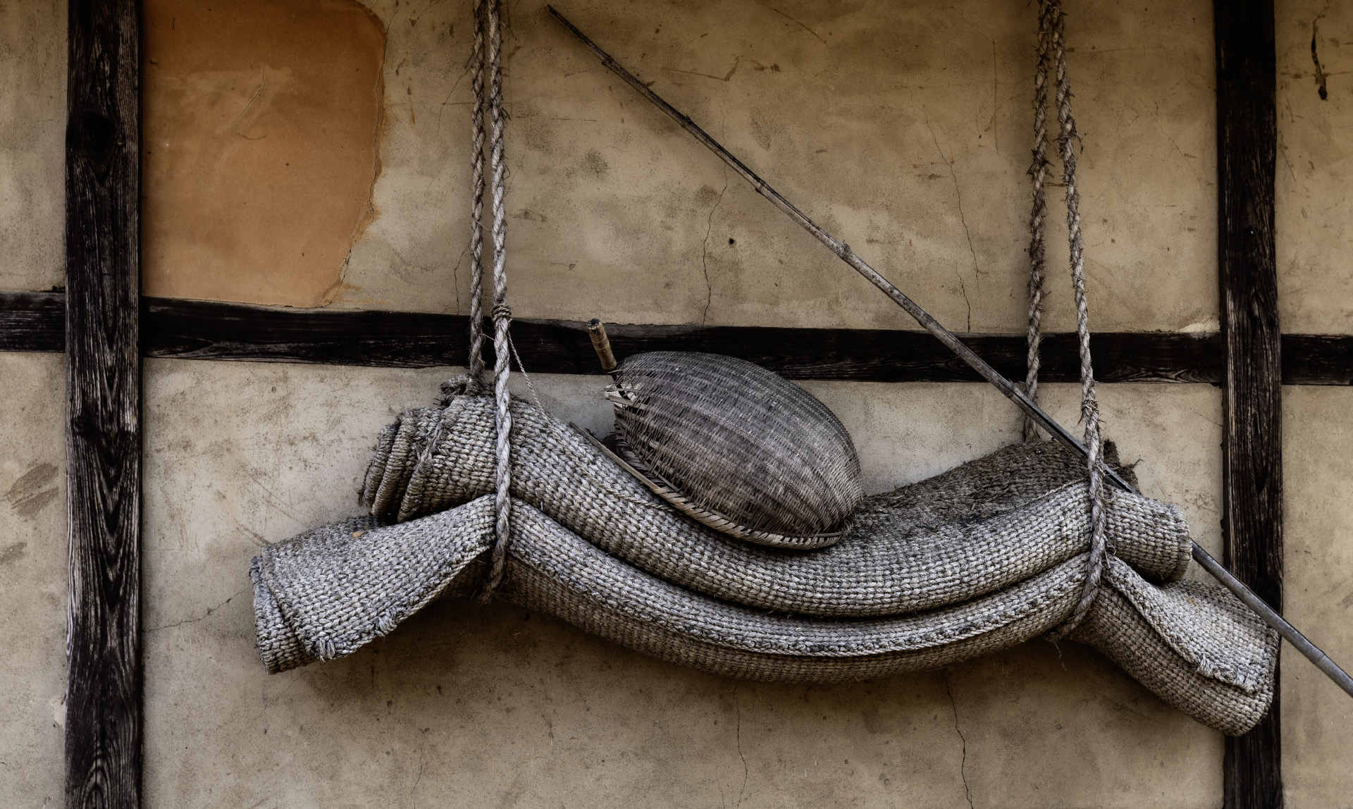 시골에서 멍석을 보관하기 위하여 처마끝 벽에 달아 놓지요
