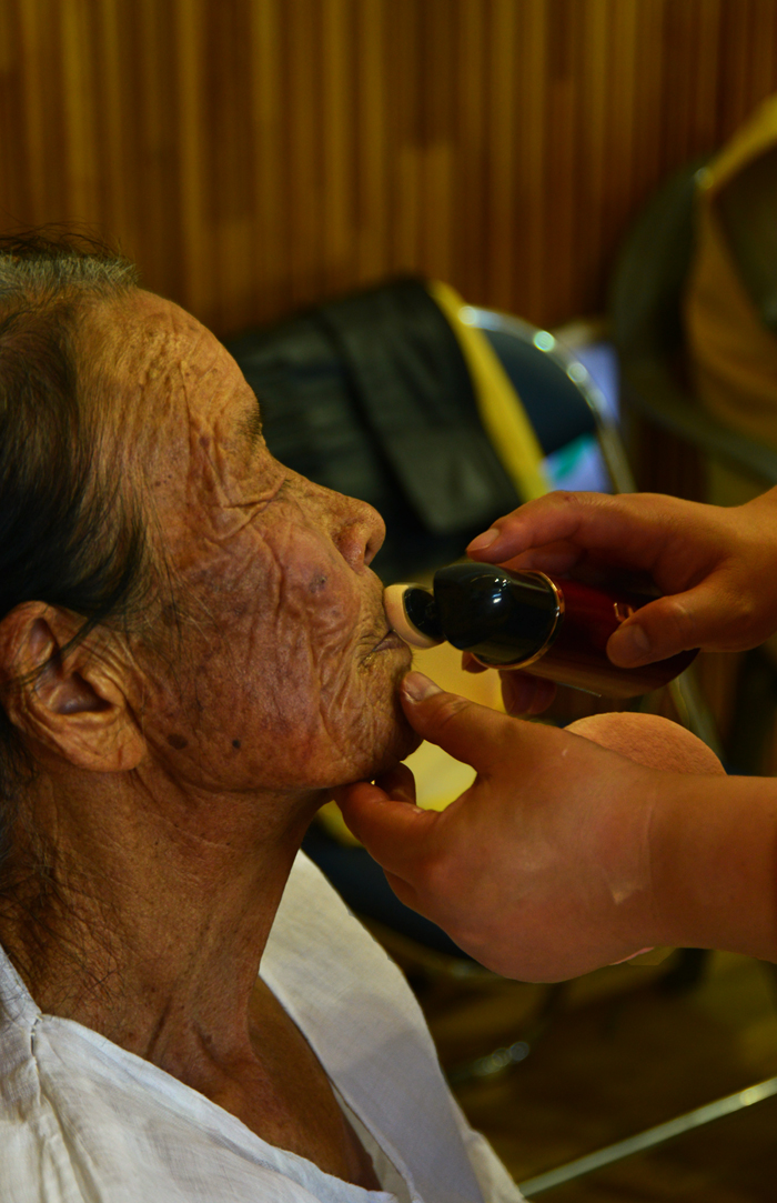 장수사진을 촬영하기 위해 머리를 손질하시는 할머니...