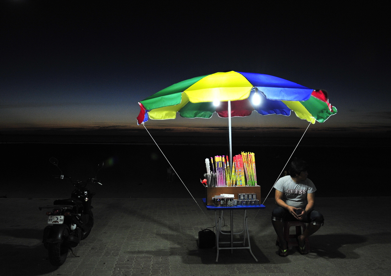 춘장대 해수욕장 폭죽 판매하는 사람