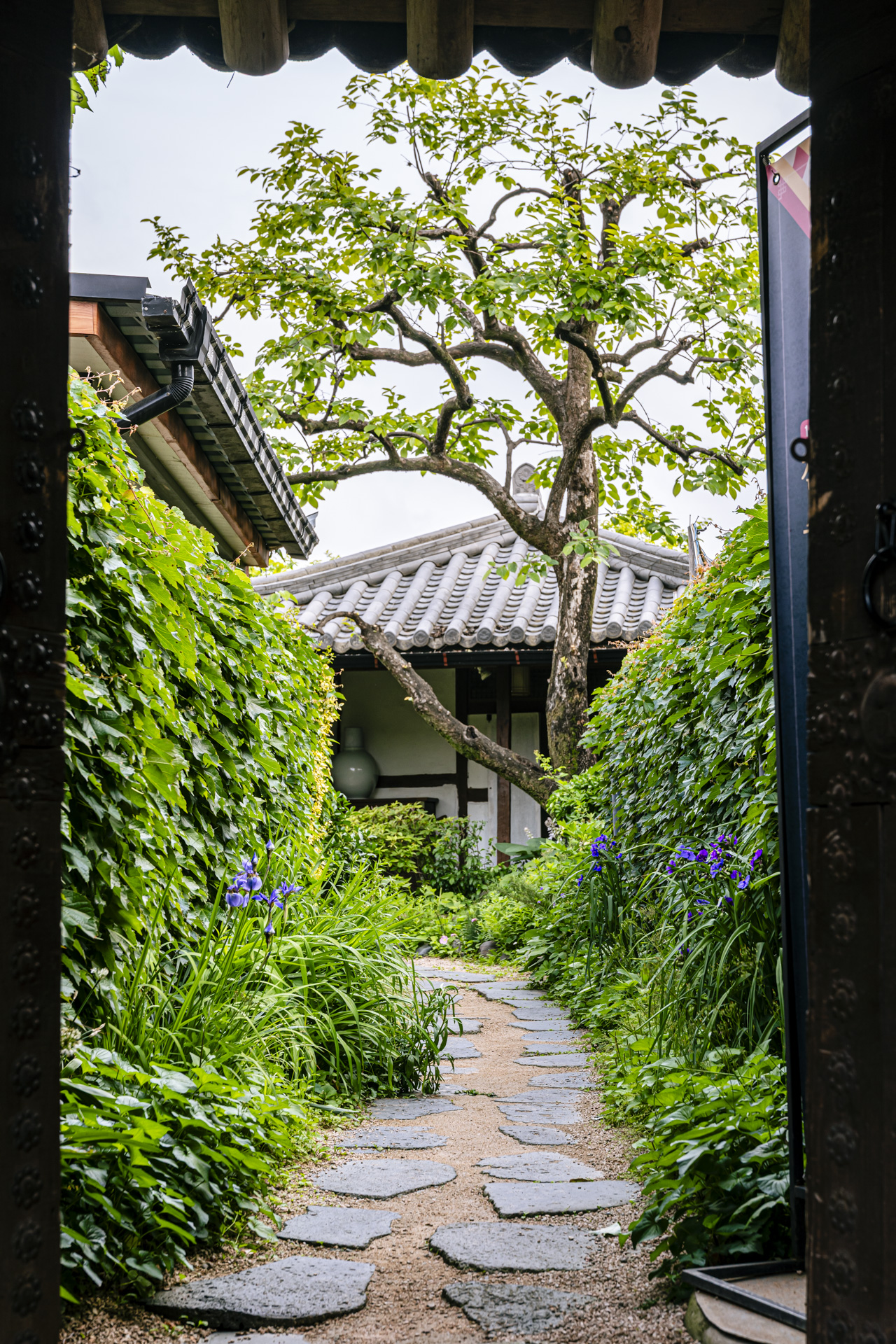 초록넝쿨과 봄꽃이 어우러진 돌담