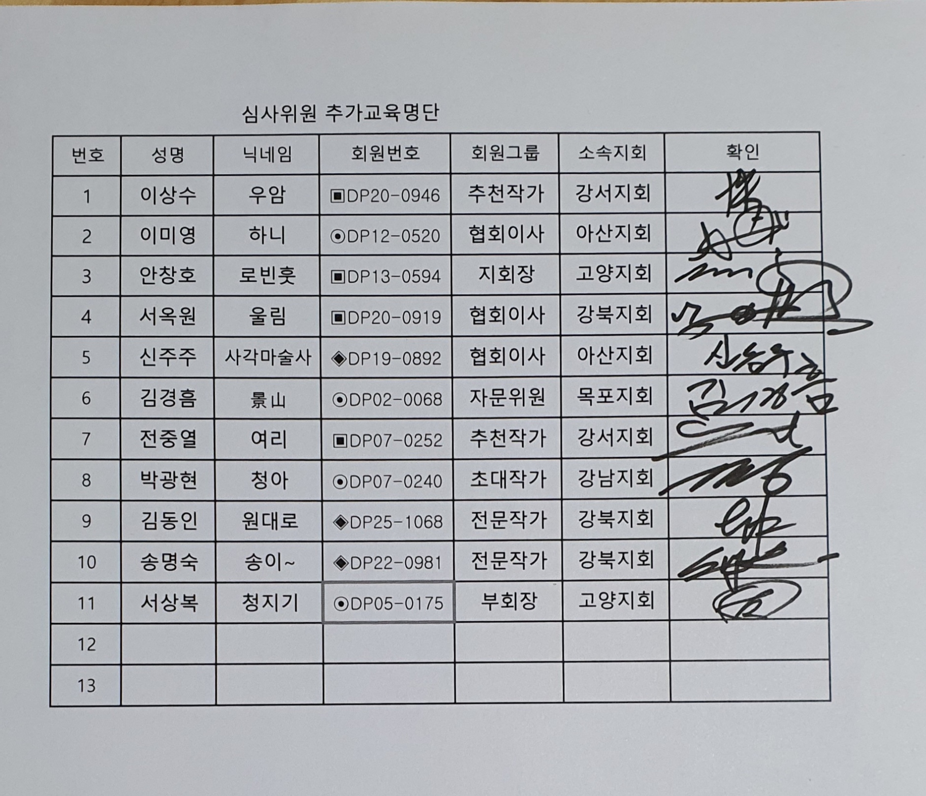 | 11 | 서상복 | 청지기 | ⊙DP05-0175 | 부회장 | 고양지회 | 강사 |