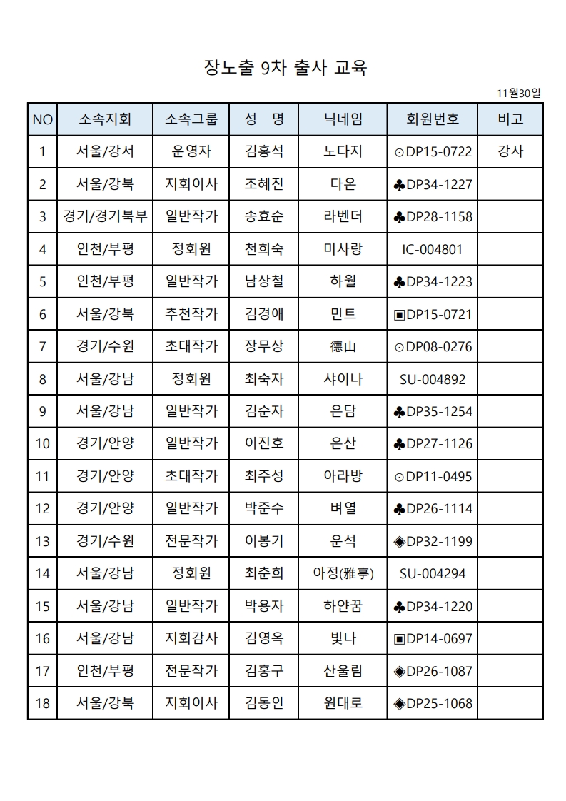 [연수실] 장노출 6개월반 종강 교육 참석자 명단