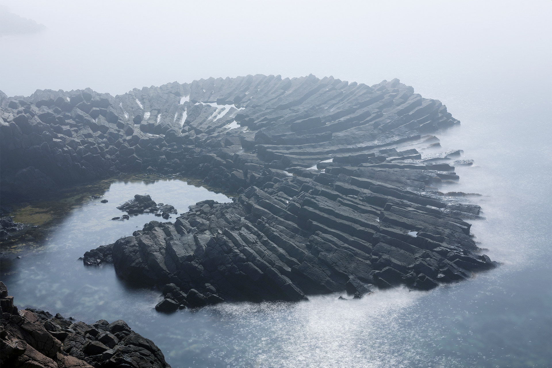 옅은 해무가 낀 부채꼴 주상절리 입니다.