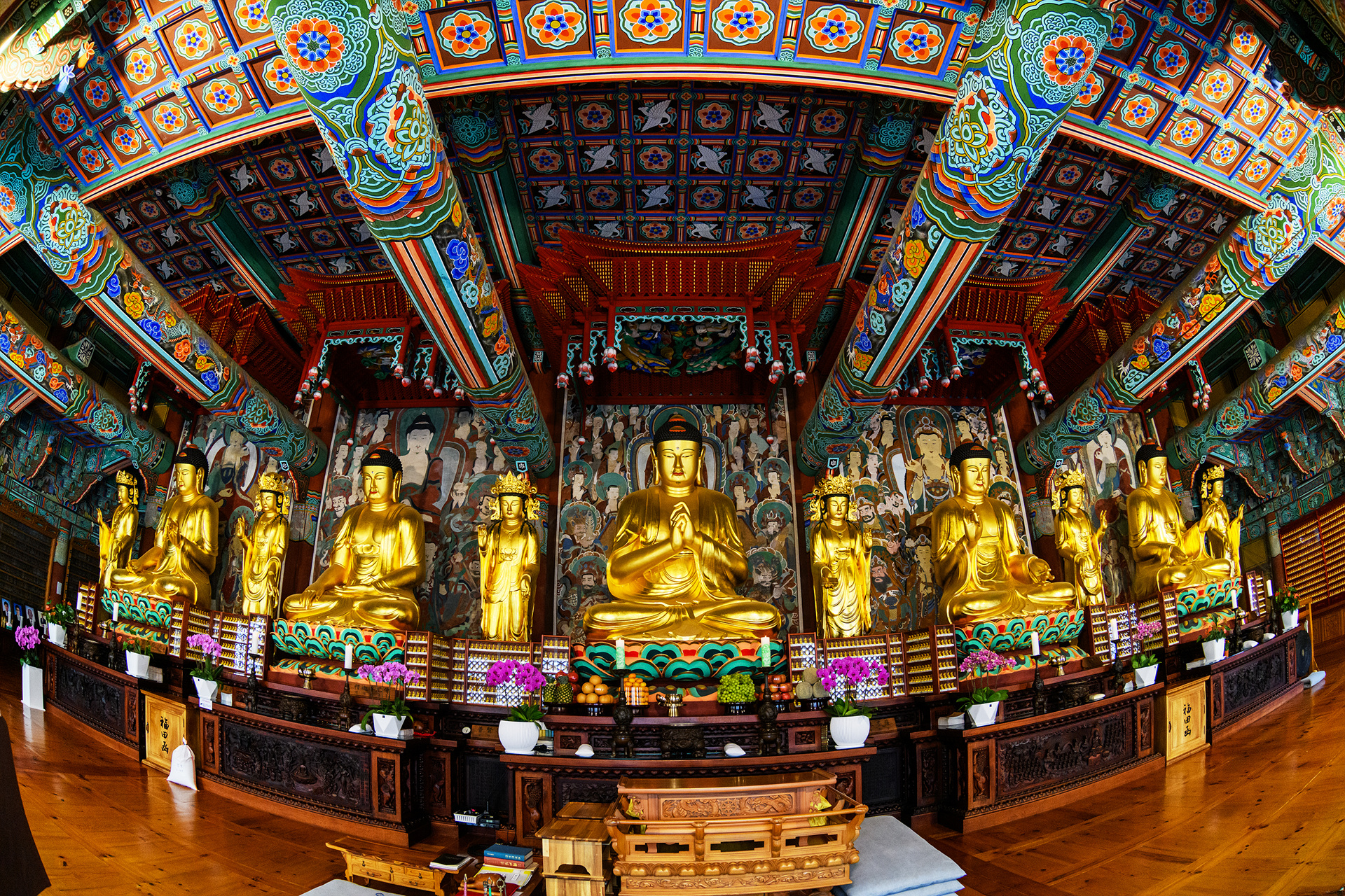 왼쪽부터 5여래인 아미타불, 석가모니불, 비로자나불, 노사나불, 약사불이 있고