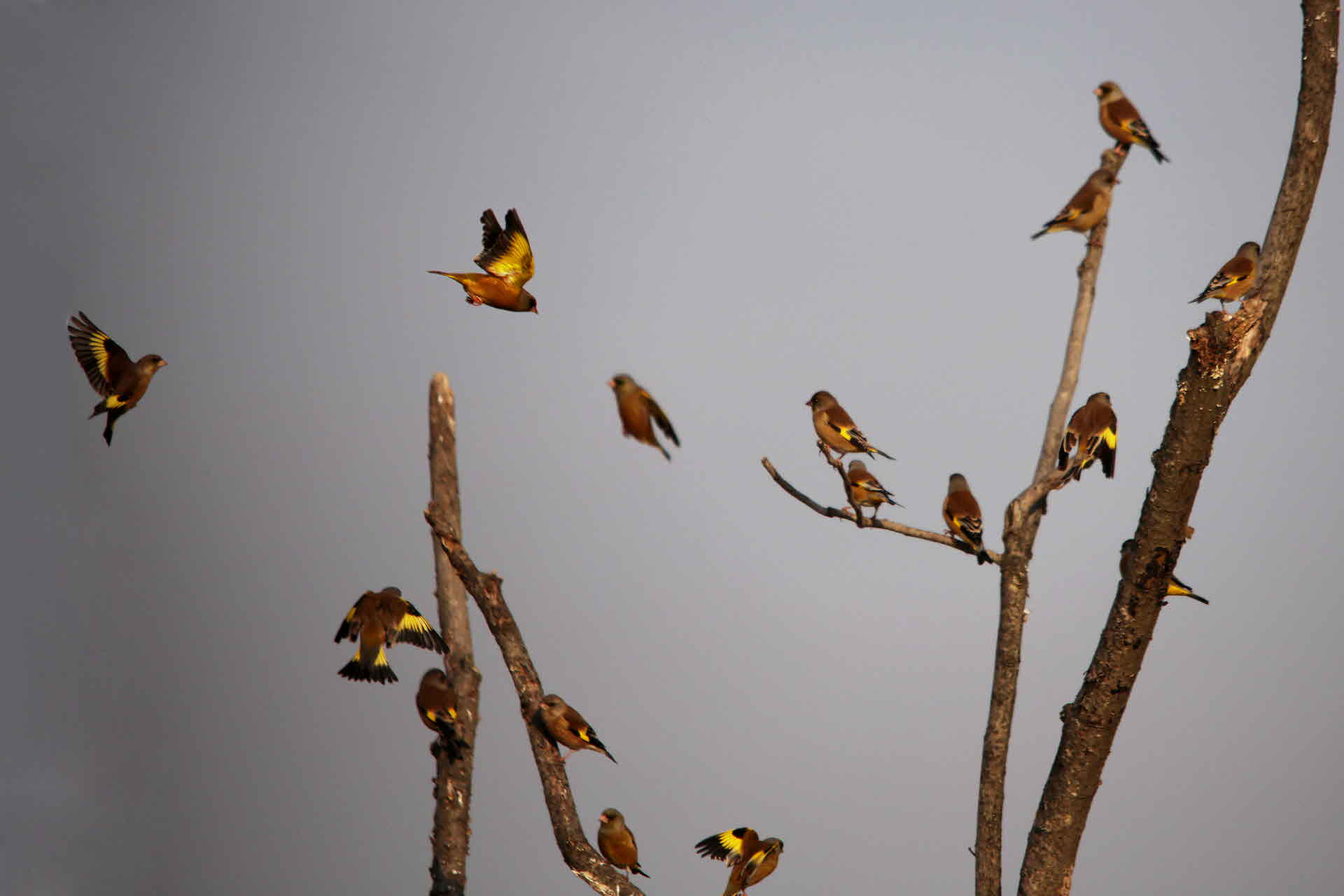 주남저수지 아래 논둑에 있는 나무에 방울새들이 조롱 조롱 매달려 있습니다.