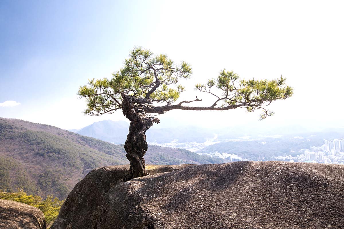 바위 뜸에서 고고하게 자라는 소나무,