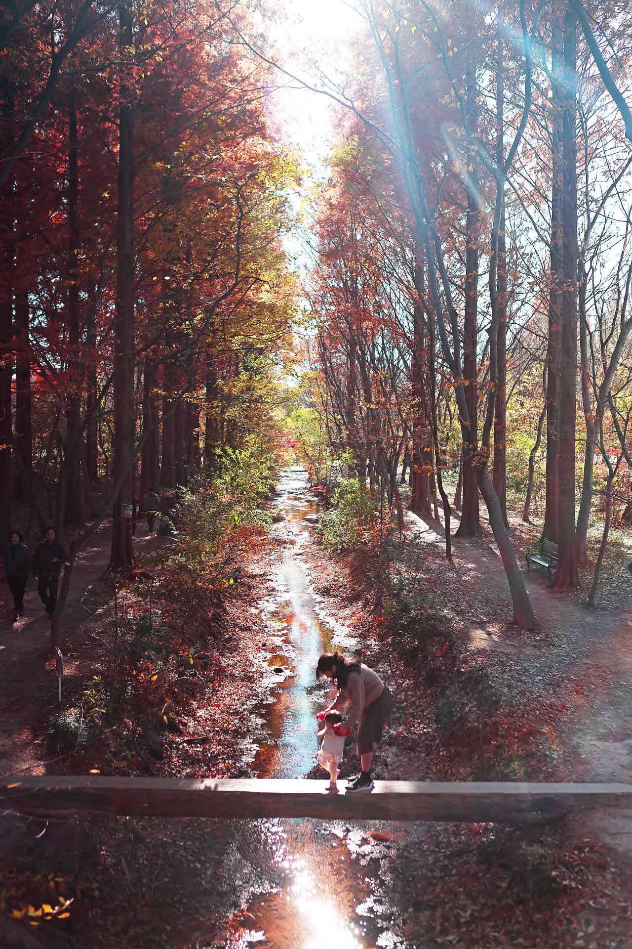 경주 경북천년숲정원의 외나무다리 위에서 아기 걸음마 연습을 시키고 있네요.