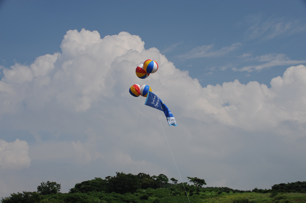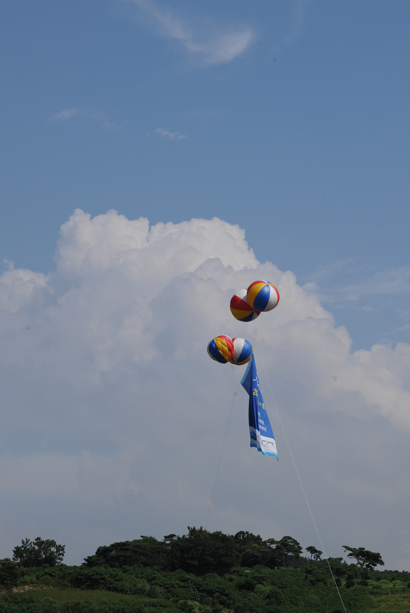 구름이 두둥실 떠있는 하늘아래 어느 행사장의 애드벌룬이 오르고...