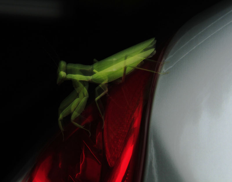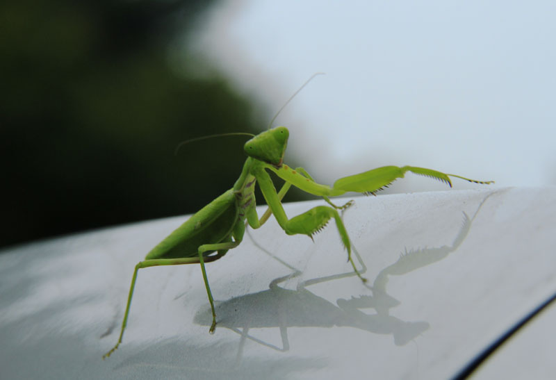 아파트 주차장 차 위에서 사마귀가 혼자 놀고 있다.