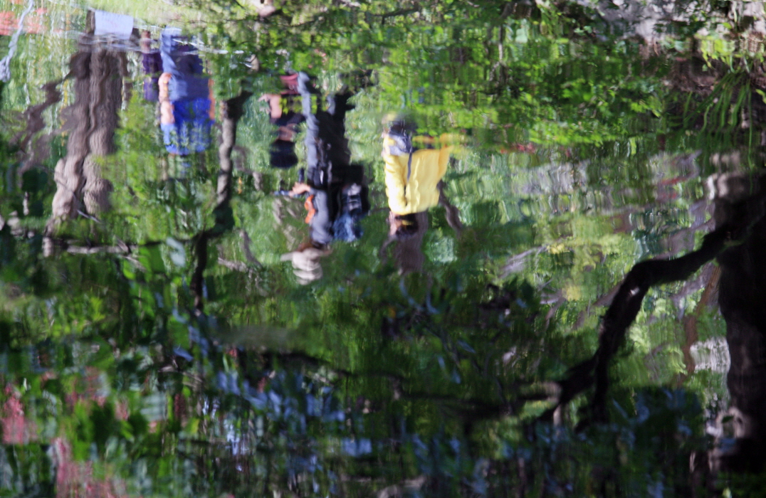 선운사 도솔천 인도로 산행인들이 걸어가는 모습이 일렁이는 물결에 비친 모습입니다