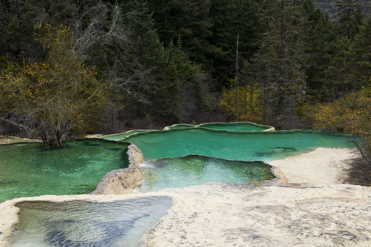 황룡 풍경구의 오채지에서 에메랄드 빛  석회암 연못을 만나다.