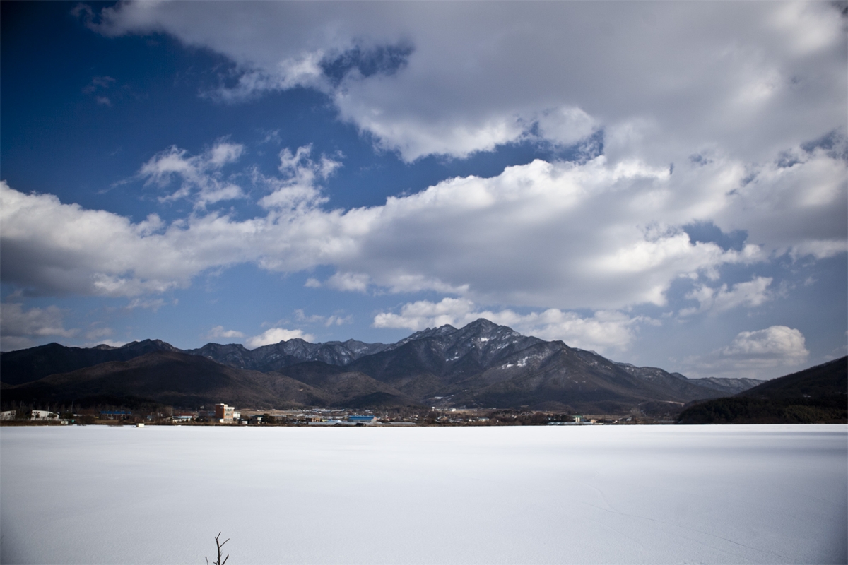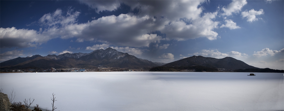 계룡저수지가 얼어붙 흰눈으로 덥은상태에서본 전경