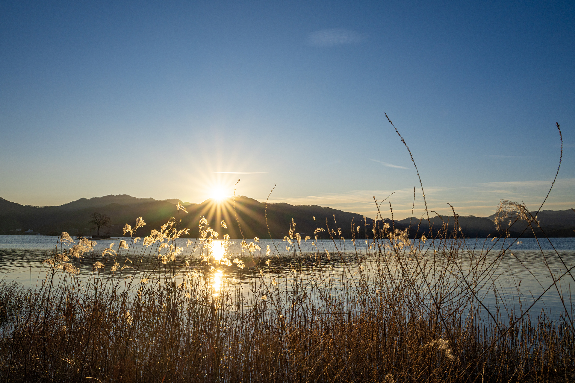 갈대잎이 빛나는 일출, 새해에는 모든 만물이 평화롭기를.