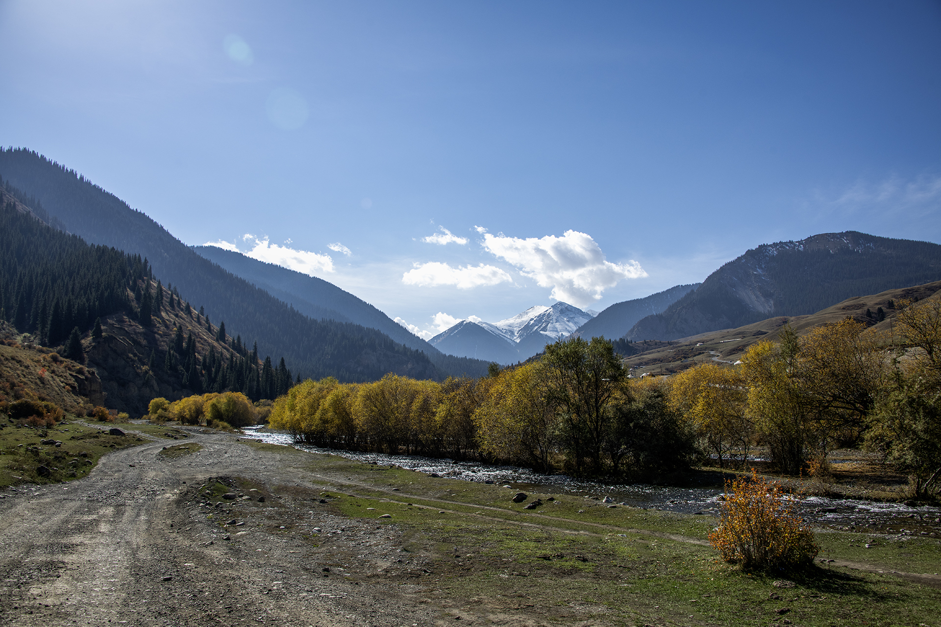 카자흐스탄에서 천산이 보이는 가을 풍경